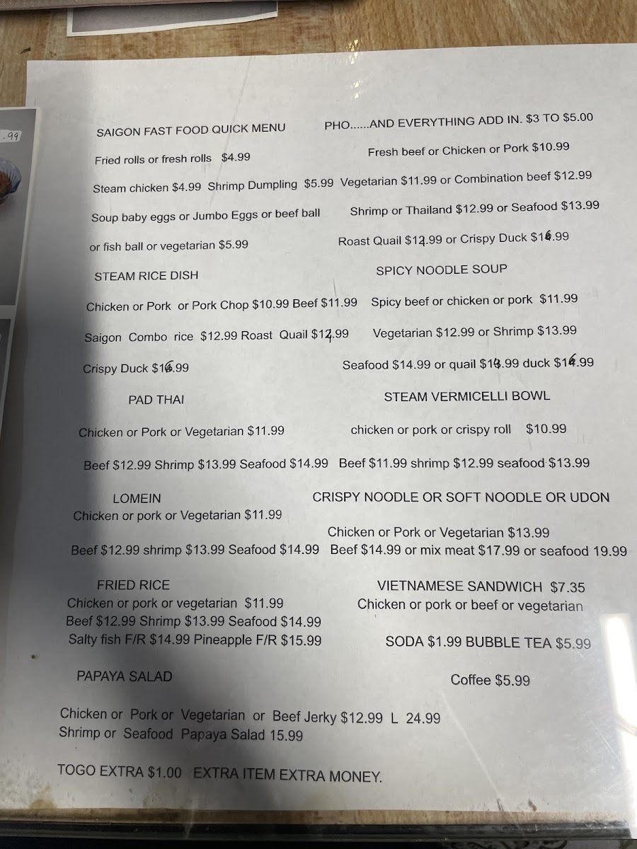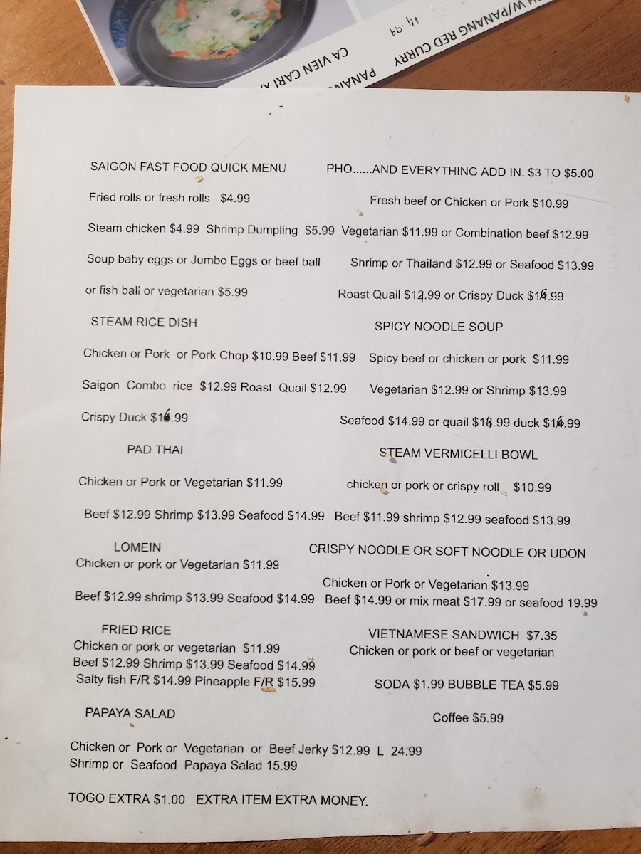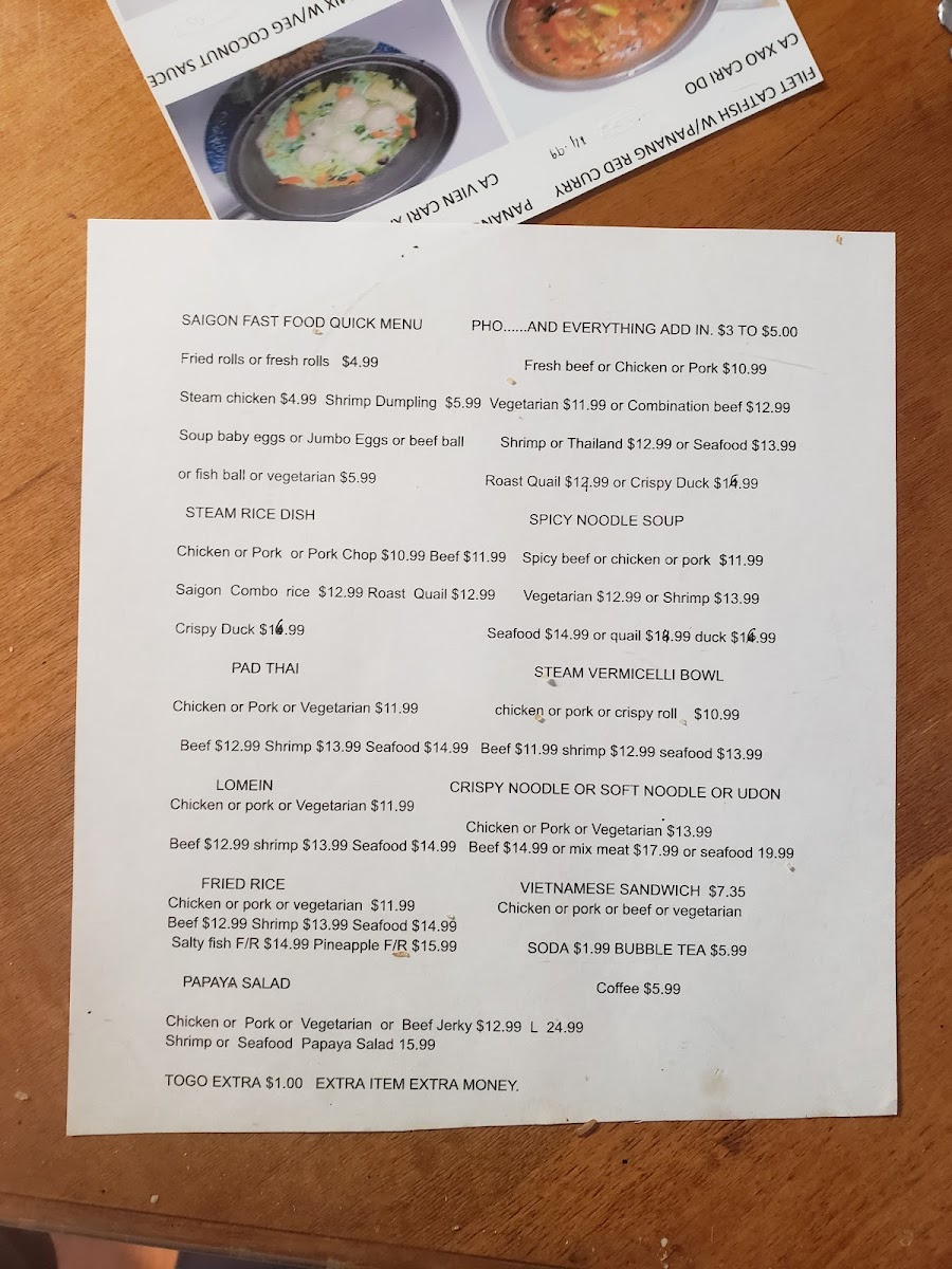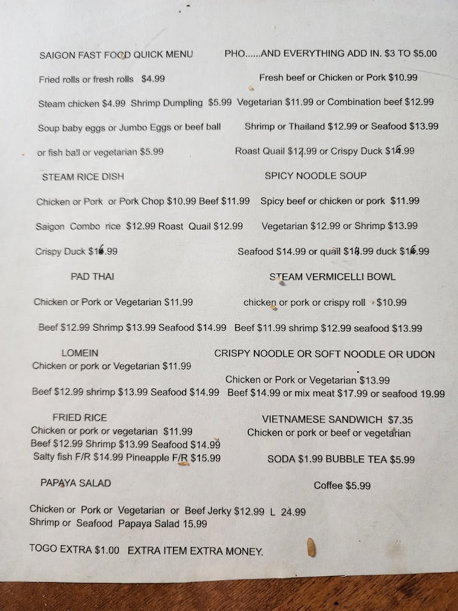 Saigon Fast Food Menu